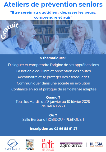 Cette action est organisée par l'association SAPARMAN en partenariat avec le CLIC de la Côte d'Emeraude et la ville de Plerguer. 5 thématique seront abordés les mardis du 13 Janvier au 10 Février de 14h00 à 15h30 -Dialoguer et comprendre l'orgine de ses appréhensions -La notion d'équilibre et prévention des chutes -Reconnaître et se protéger des escroqueries -Communiquer dans une société en évolution Confiance en soi et pratique du self défense adaptée